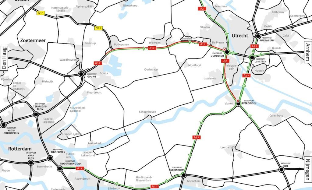 Let op: tussen knooppunt Oudenrijn en afrit Woerden (14) is slechts 1 rijstrook beschikbaar voor bestemmingsverkeer. Ook zijn er in deze weekenden werkzaamheden op de A2 richting Utrecht en is de A2 dicht van knooppunt Everdingen tot knooppunt Oudenrijn.